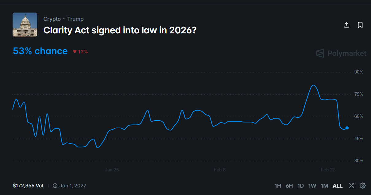 The outlook for the Clarity Act shifted sharply on prediction markets this week amid uncertainty. Polymarket odds fell from 70% to 53% and then rebounded partially later on Tuesday.