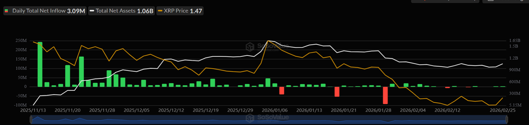 According to SoSoValue data, XRP spot ETFs recorded $3.091 million in net inflows on Tuesday Eastern Time. Bitwise XRP ETF gained the most, adding $2.29 million throughout the session on February 25 trading. The cumulative historical inflows into it have reached $370 million, which shows a consistent investor desire in the product.