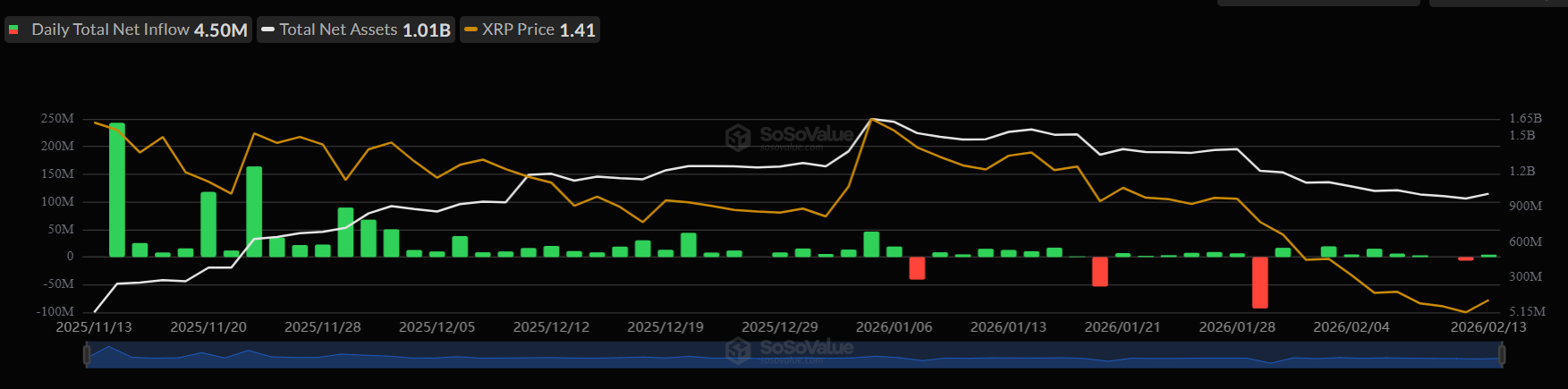According to Sosovalue data, XRP-focused ETFs attracted solid inflows at the latest close. Daily net inflows totaled $4.50 million as of February 13, reflecting renewed buying activity.