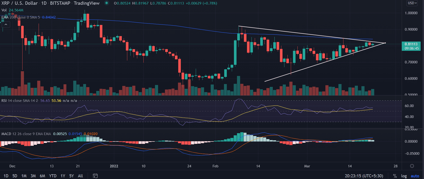 Looking at the possibility of the breakout, It is important to analyze the volume’s trend. While the price is moving higher, volumes were also rising. This indicates the trend is in favor of a bullish breakout. Now, if that happens, in that case, XRP must face the 200-day SMA (Simple Moving Average) at $0.84 as the first step toward further upside movement.