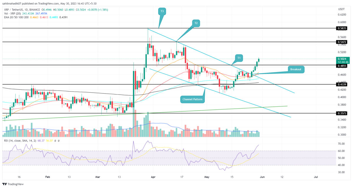In the daily time frame chart, the six consecutive green candles show promising signs of recovery in the XRP price. From the weekly low of $0.4431, the coin price surged nearly 12.5% to reach the current price of $0.5.