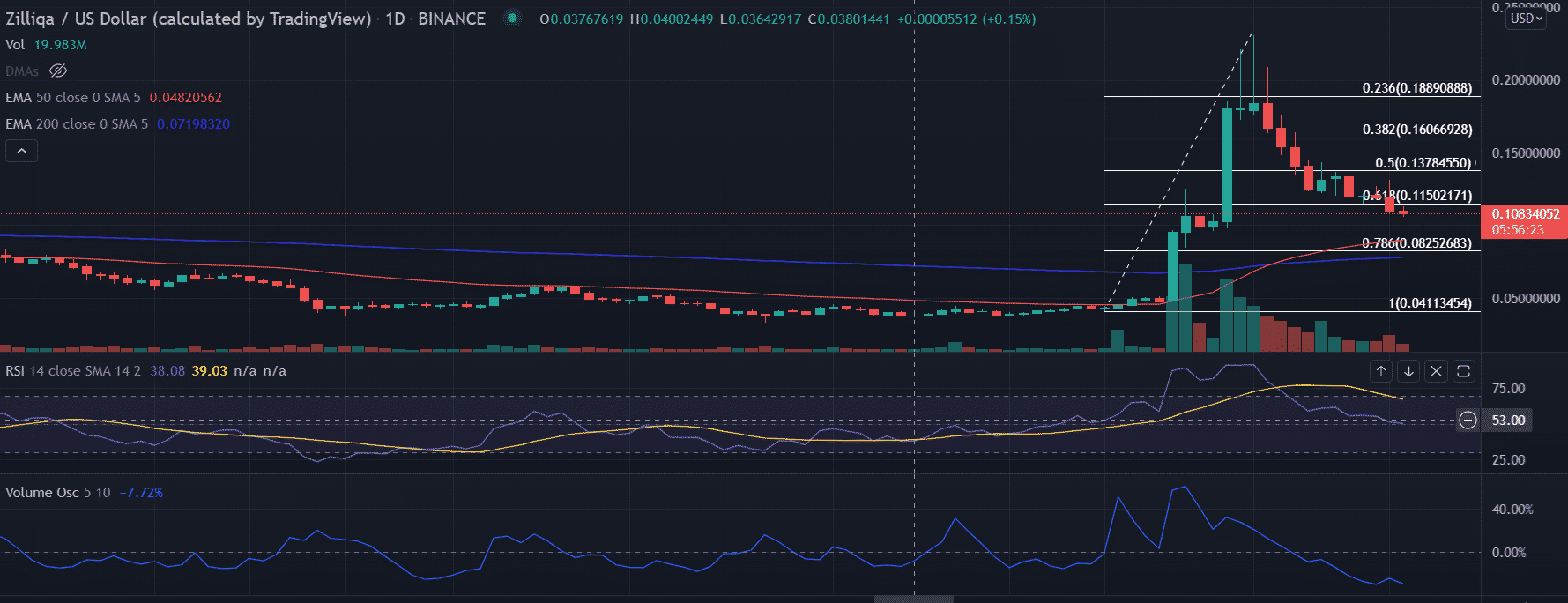 - Expect, a bounce back in the price if the price gives a daily close above the 0.618% Fibonacci retracement at $0.11.