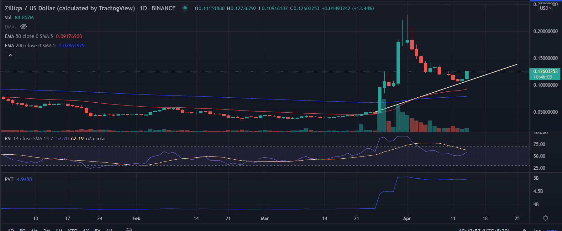 On the daily chart, the ZIL price found strong support near the $0.10 level. The price moves along the ascending trend line, which is extending from the low of $0.04 made on March 26.