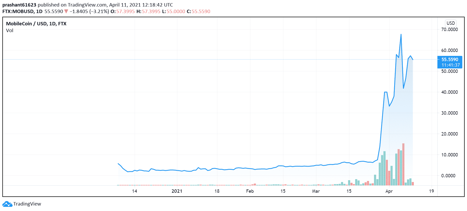 Mobilecoin (MOB), a fairly unknown token has risen from $7 to a new ATH of $68 right after Signal encrypted chat services announced they would begin mobile payment services using $MOB on April 4. The signal gained a lot of traction in the past couple of months owing to their privacy features and a shout-out from Elon Musk.