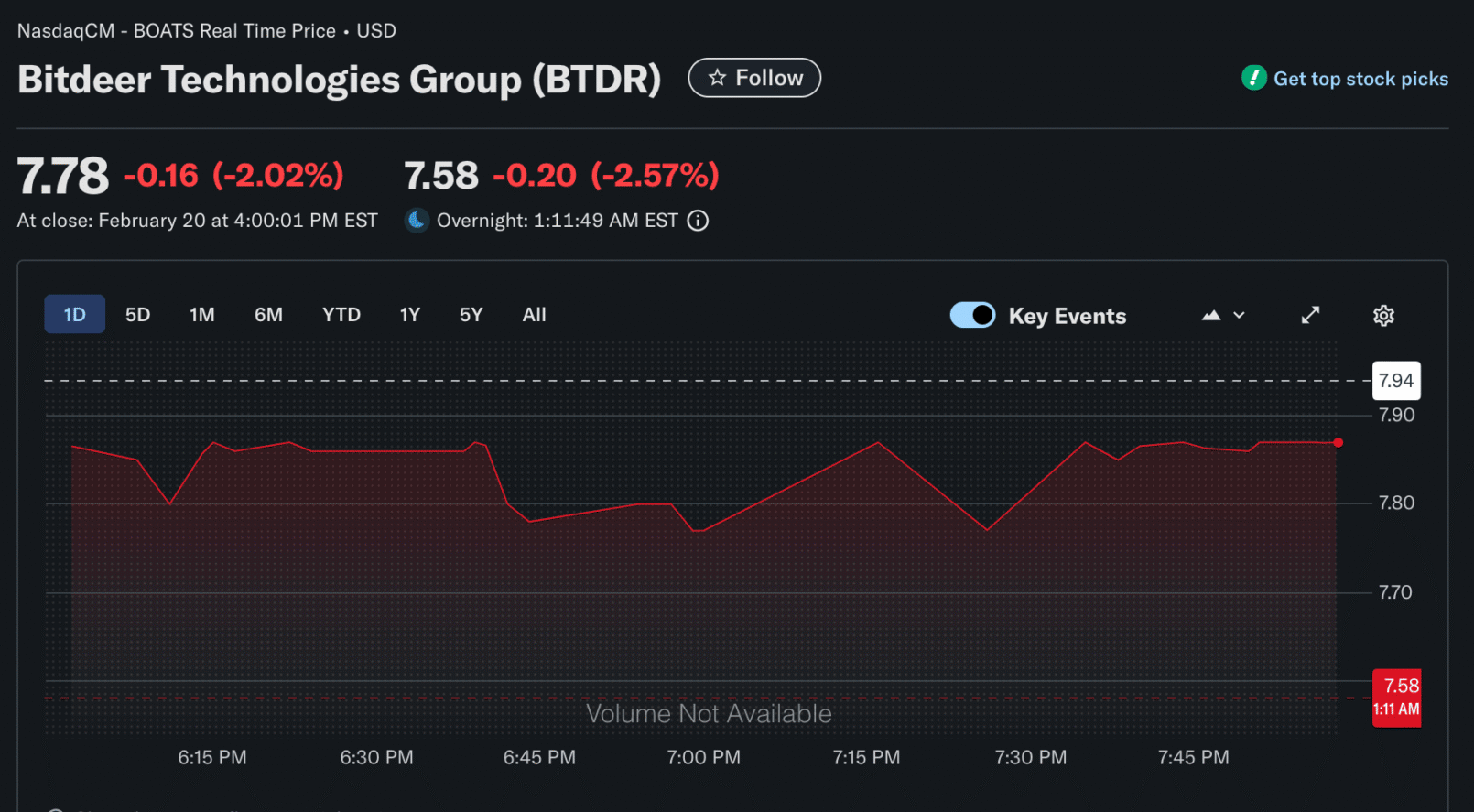 According to YahooFinance, the BTDR stock crashed by nearly 3% in overnight hours, continuing the decline seen at the close of the market on Friday. Data showed it had fallen even deeper through the weekend as traders priced in developments with its treasury.