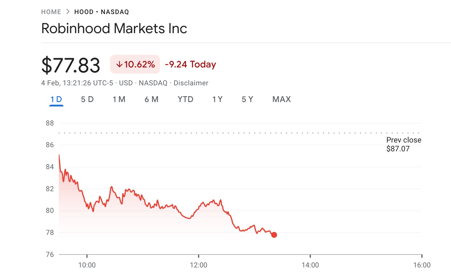 At the time of writing, HOOD stock was trading at $77.83, down 10.62% in 24 hours, according to Yahoo Finance data. The decline comes ahead of Robinhood’s Q4 and full-year 2025 earnings release on February 10, 2026.