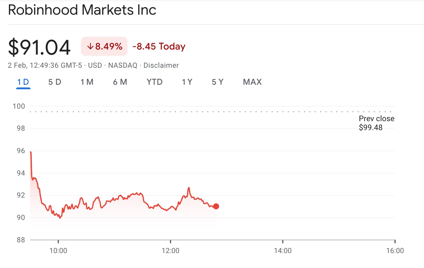 At the time of writing, Hood stock was trading at $91.04, down 8.49% over 24 hours, according to Yahoo Finance. The stock extended losses into a fifth straight session. As per Bloomberg’s Walters, Robinhood shares fell to a seven-month low.