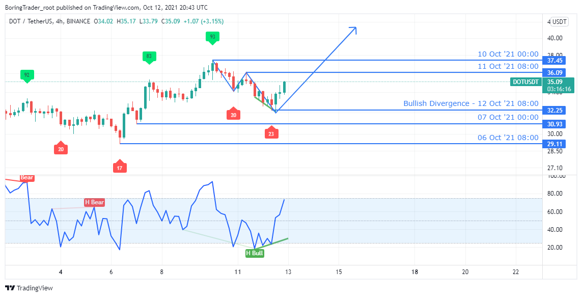 A hidden bullish divergence signaled at the time of this report suggests the intraday price floor as the DOT price scurries towards the $37.45 resistance.