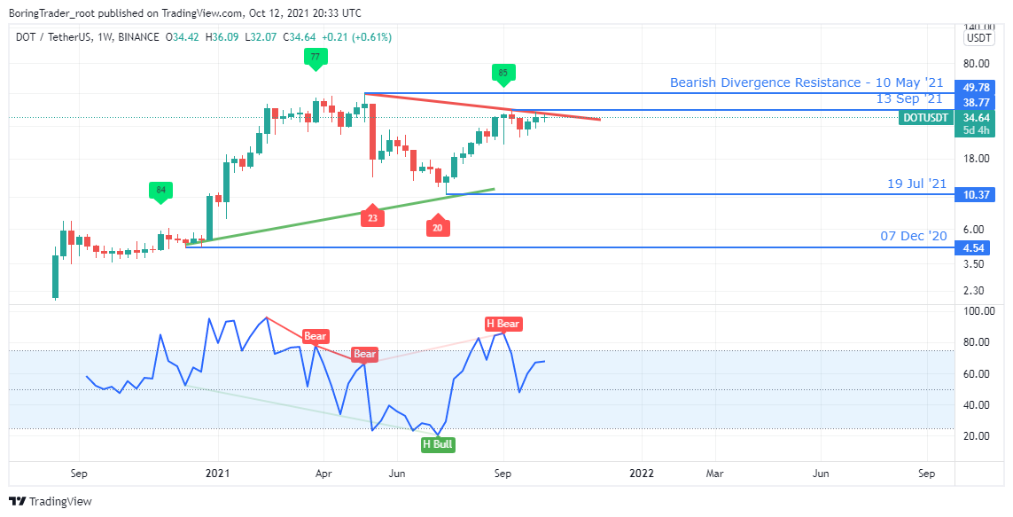 The above weekly chart of the DOTUSDT shows the DOT price enclosed in a symmetrical triangle, formed by opposing bearish and bullish divergence patterns after the RSI exits the overbought area.