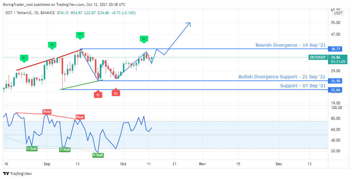 A view from the daily time frame reveals the DOTUSDT in an ascending channel, also formed by opposing bearish and bullish divergence price vs. RSI oscillator pattern.