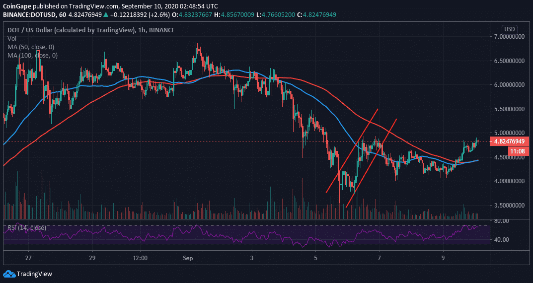 Polkadot broke down from the ascending channel, discussed last week. Luckily, support at $4.00 came in handy, preventing acute declines from taking over. A reversal, therefore, ensued with buyers increasing their entries. A break above both the 50 Simple Moving Average (SMA) and the 100 SMA in the 1-hour chart encouraged the bulls to increase their entries in anticipation of a rally towards $5.00. At the time of writing, DOT/USD is dancing at $4.80 amid a struggle to overcome the short term resistance at $5.00.
