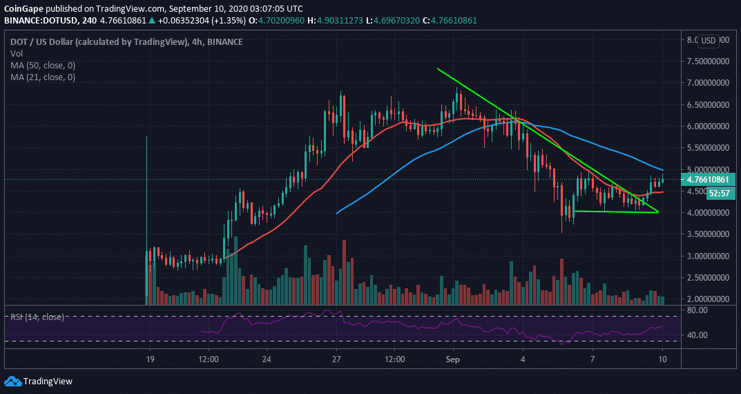 The 4-hour chart, prints a bullish picture for DOT/USD, especially after a breakout above a falling triangle pattern. Triangle patterns are some of the most common technical analysis tools. They help the traders predict a change from the prevailing trend and the extent to which the new trend can reach. In this case, the triangle breakout is likely to catapult DOT above $5.00.