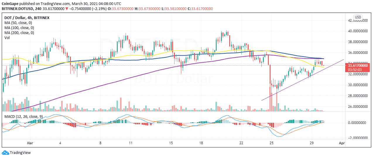Polkadot had staged an impressive recovery on Monday, extending the bullish leg from the recently formed support at $27. The token hit highs above $30 and pushed for gains beyond $35. However, bulls lost steam within a whisker of a confluence resistance created by the 100 Simple Moving Average (SMA) and the 200 SMA on the 4-hour chart.