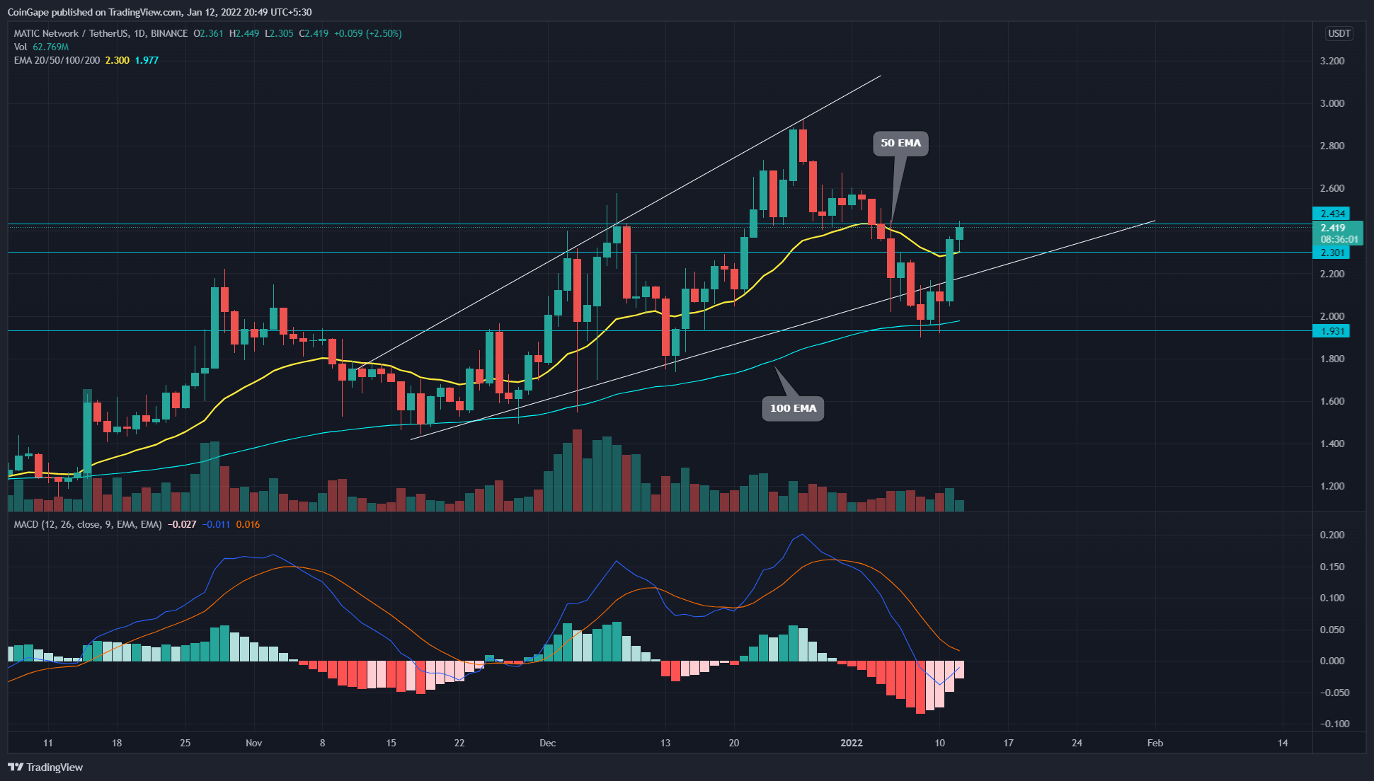 The MATIC price has pumped 26.8% in just three trading days. This V-shaped recovery in price is currently at the doorstep of another resistance of $2.43, preparing for a bullish breakout. However, in case the price rejects from this resistance, the support trendline and $2.4 can still maintain a bullish sentiment.