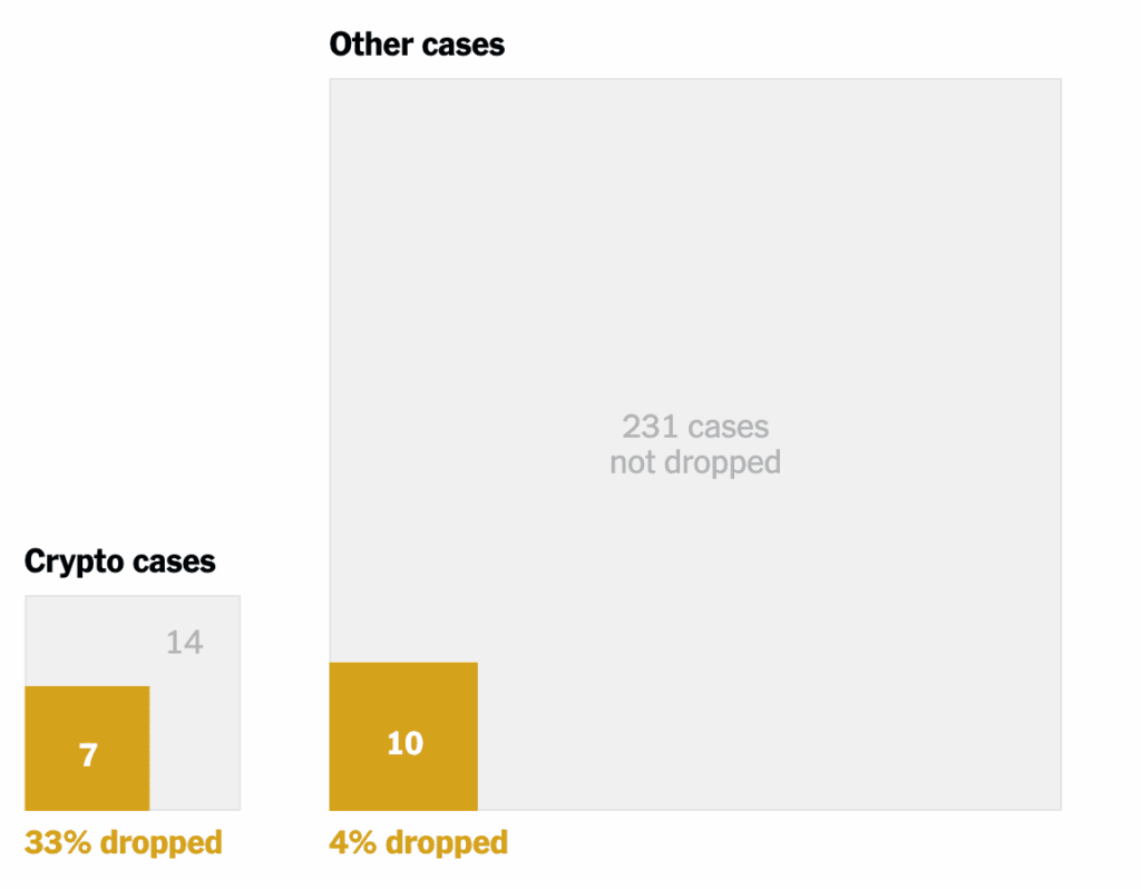 The Times found that the second administration dismissed roughly a third of the inherited Biden-era crypto cases, as compared with about 4% involving other industries.