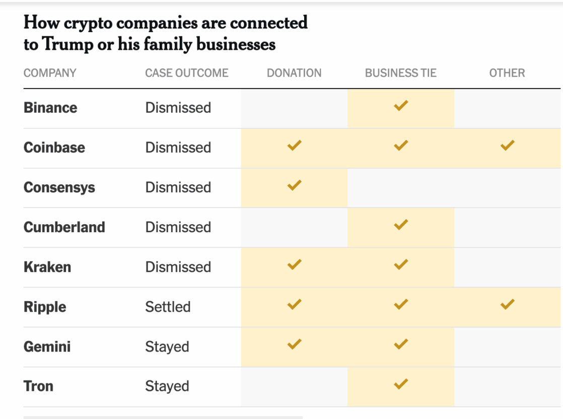 One example is the crypto company started by the Winklevoss twins. This company faced a federal lawsuit, and once the administration changed, regulators tried to freeze the case. Around the same time, the SEC wholly abandoned its case against Binance.