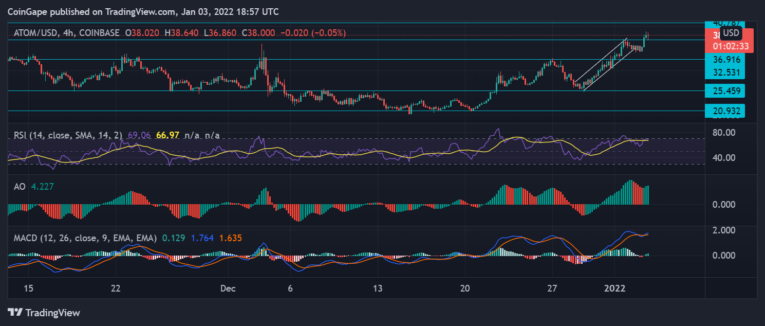 ATOM was trading within an ascending channel, securing higher highs in the past week. At press time, the coin was seen trading outside the channel. ATOM hadn’t gone past the $36.91 mark in almost two months. However, in the last 24 hours, the coin was seen trading above that price mark.
