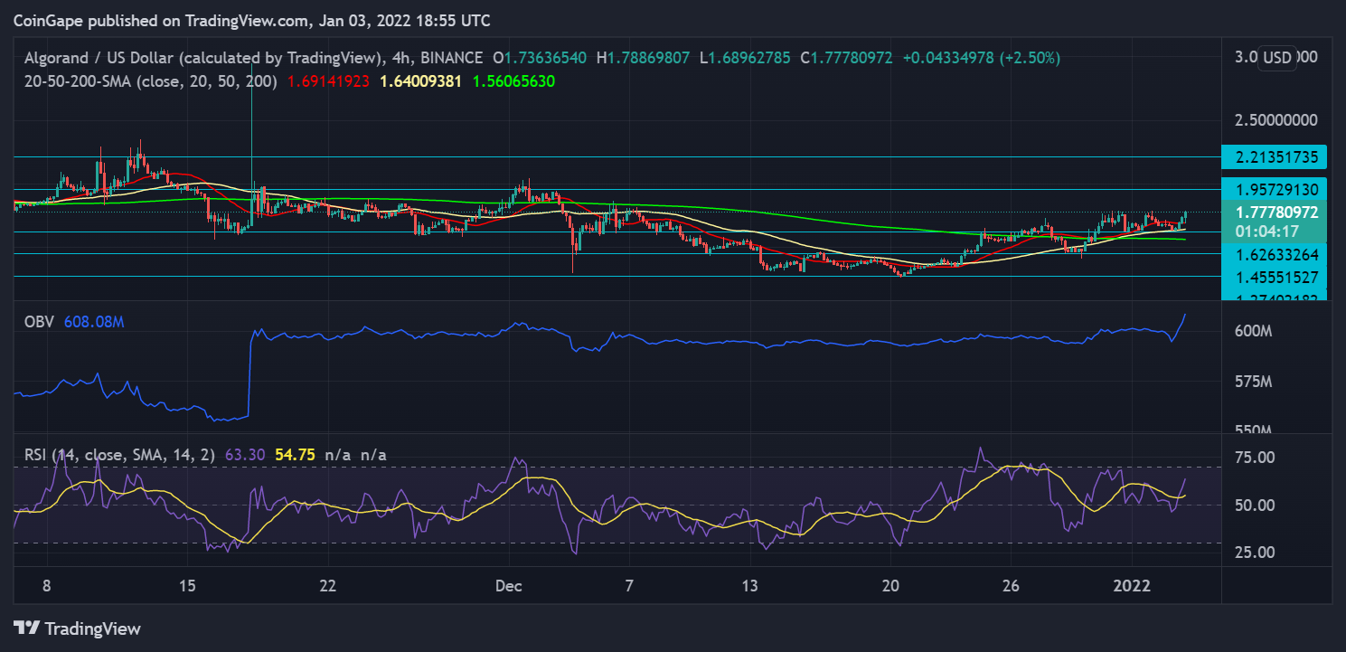 Algorand was priced at $1.77 with a price ceiling at $1.95. On the reverse, ALGO’s price floor stood at $1.62, and the coin had secured robust support at the $1.44 price level. Although ALGO mostly displayed trading within an immediate resistance and price floor, it registered significant gains. In the past 24 hours, the coin rose 8.4%.