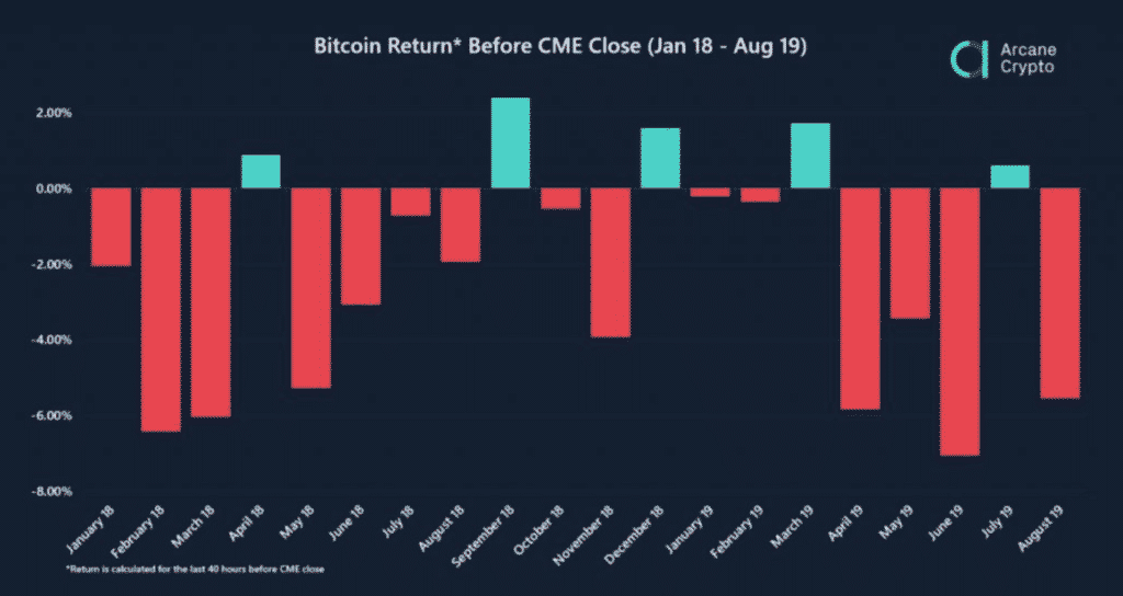 According to a research report from Arcane Crypto, there is a clear correlation between contract settlement and negative intraday Bitcoin returns. The report further suggests that since January 2018, on average, bitcoin falls 2.27% as it approaches the CME expiration date.