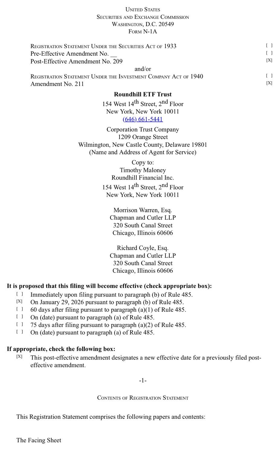 The company has filed a Form 485BXT amendment to the U.S. Securities and Exchange Commission. It amended the registration information regarding the Roundhill XRP Covered Call Strategy ETF.