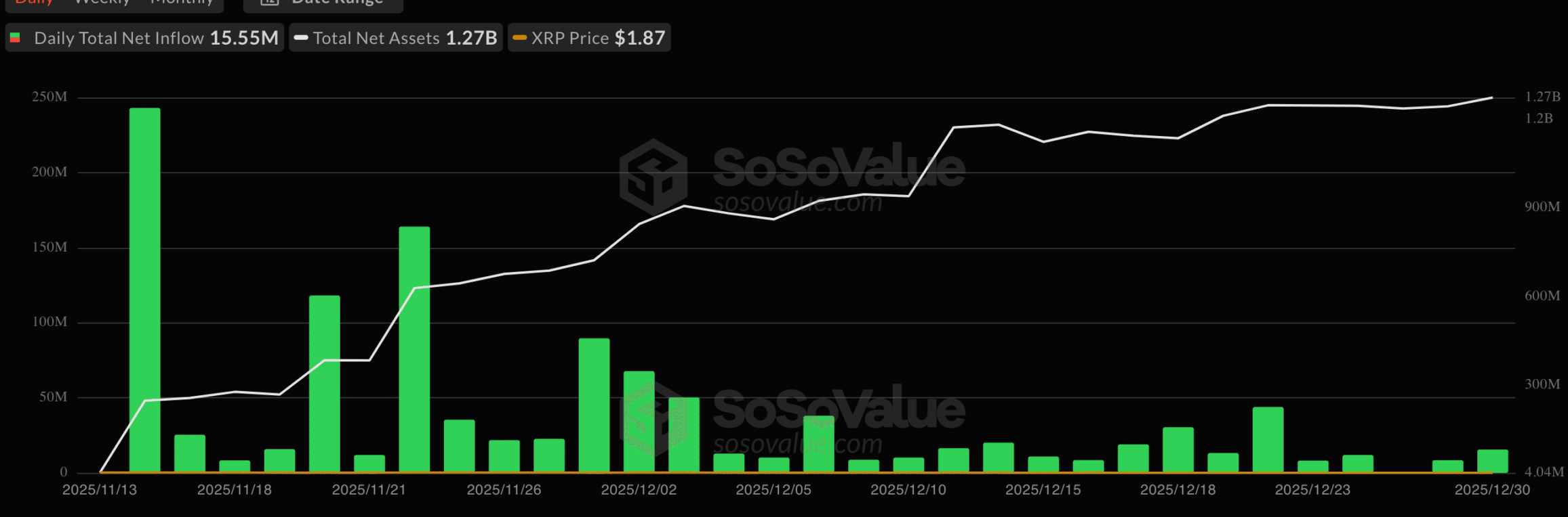 As per data by SoSoValue, the total net inflows of spot XRP funds on December 30 amounted to $15.55 million. This took the cumulative inflows to about $1.16 billion since the launch. This is despite the total assets under management being at $1.27 billion, which is close to the previous level despite selling pressure in the crypto market.