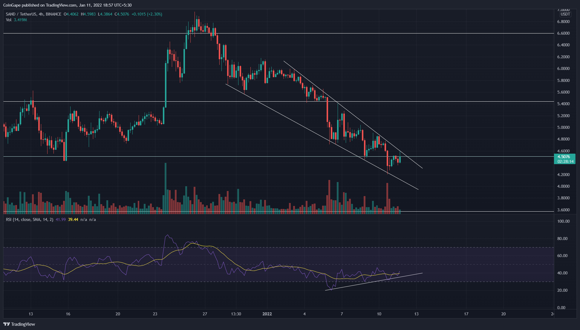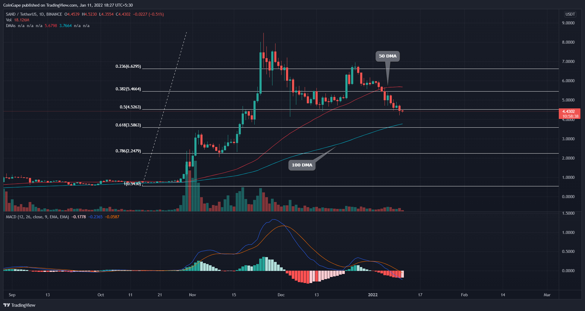 Entering the year 2022, the market sellers took an upper hand over the SAND price. The pair was rejected from the $7 mark and lost 34% of its value by dropping to the $4.48 mark. The price has recently plunged below the 0.5 FIB level, indicating the token could extend the correction phase.