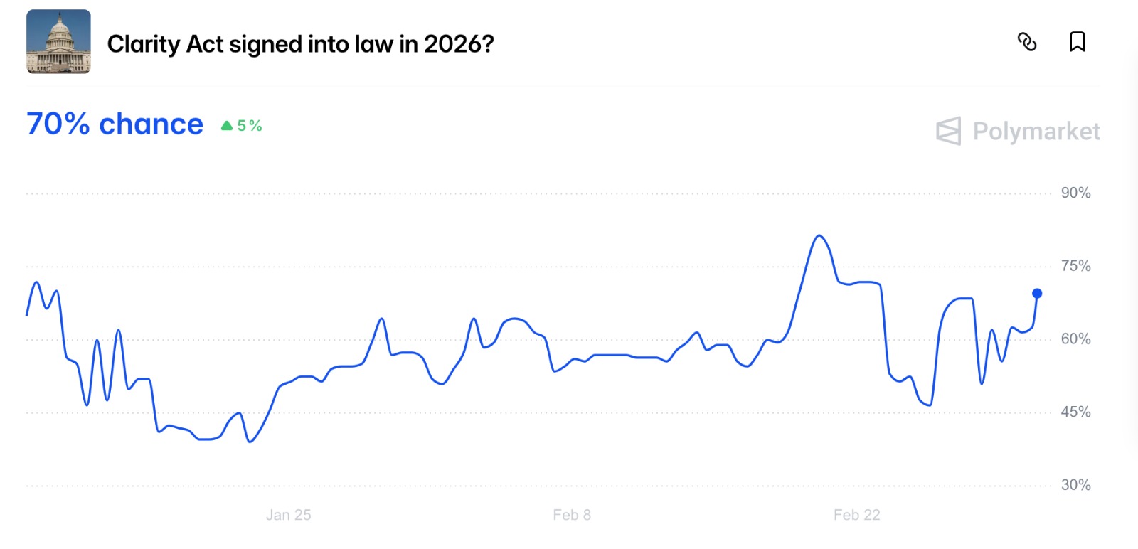 Prediction markets show mixed expectations for the CLARITY Act. According to Polymarket, traders assign a 70% chance that lawmakers will sign the bill into law in 2026. Meanwhile, Kalshi shows only a 6% probability of passage before April, 22% before May, and 41% before June.