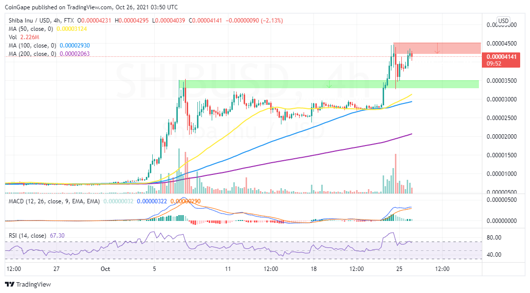 Nonetheless, Shiba Inu is yet to close the distance at $0.000045 but trading at $0.000041 at writing. Support at $0.00004 is expected to come in handy and aid the bulls in stopping the potential pullback to $0.000035.