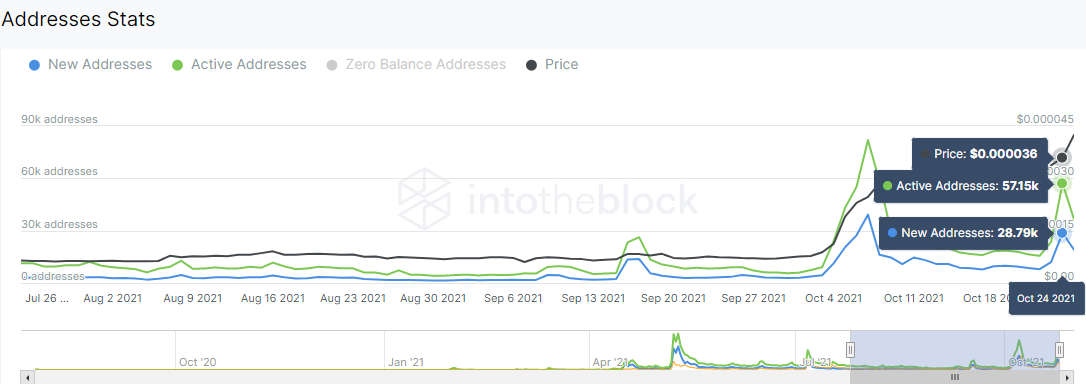 The token’s network activity has been on an upward roll based on on-chain data by IntoTheBlock. Realize the number of new addresses created on the Shiba Inu protocol recently spiked to roughly 29,000 while the number of active addresses per day shot up to 57,000.