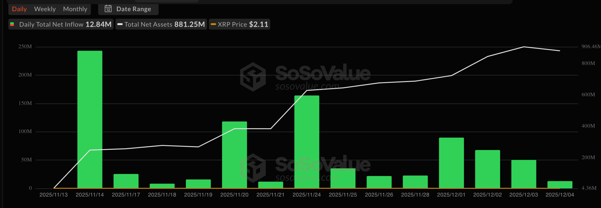 Since its first launch on November 14, spot XRP funds have seen continued inflows. According to data from SoSoValue, the total inflows into these funds have now risen to $881.25 million. The funds attracted $12.84 million of new money yesterday. The daily trading volumes remained stable at $26.74 million.