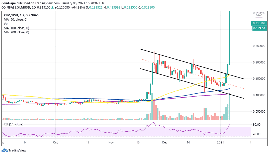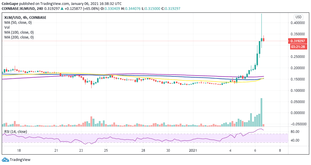 Stellar has in the last 24 hours soared to astronomical levels, perhaps becoming one of the most improved altcoins. The cross-border token is up 78% to exchange hands at $0.33. Meanwhile, it has also corrected from a new yearly high of $0.44.