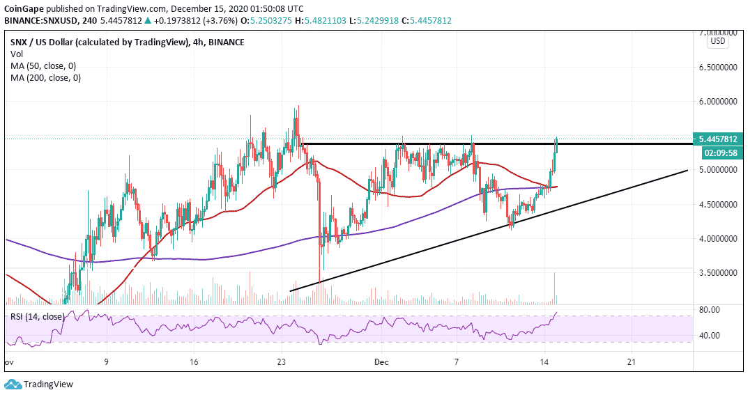 Synthetix has rallied over 16% in the last 24 hours. The decentralized finance token is trading at $5.45, as bulls push to sustain gains above the already broken x-axis of the ascending triangle pattern. The RSI is in tandem with the upward momentum, moving higher within the overbought region.