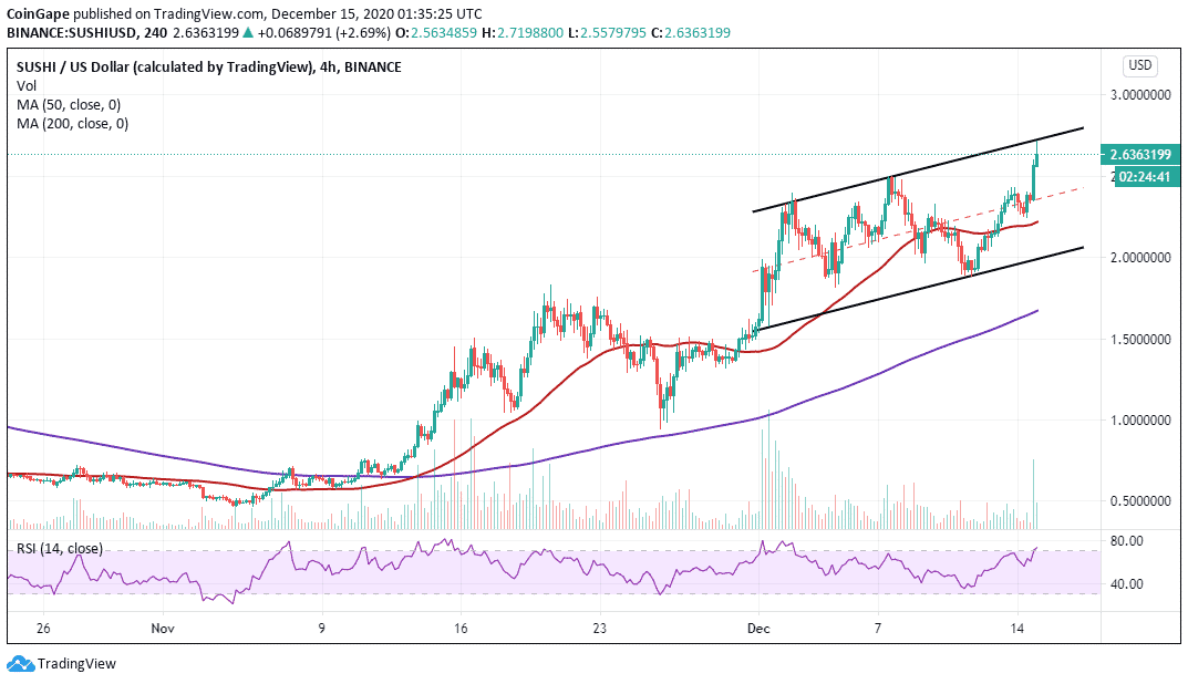 SUSHI/USD is up 13% in the last 24 hours. Recovery was significant after the dip to levels slightly under $2. An ascending parallel channel has come into the picture and even boosted the price action after the middle boundary resistance was broken.