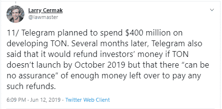 Leading Data Researcher, Larry Cermak said that Telegram planned to spend $400 million on developing TON. Several months later, Telegram also said that it would refund investors’ money if TON doesn’t launch by October 2019.