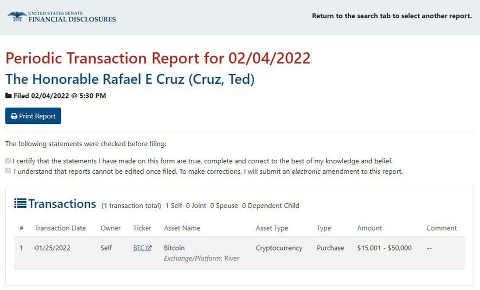 The junior Republican Senator from Texas, Rafael Edward Cruz made a bitcoin purchase during the recent dip shows his new financial disclosures with the US Senate. The financial disclosures filed on Friday, February 4, depict that Cruz made a bitcoin purchase on January 25 valued between $15,001 and $50,000.