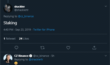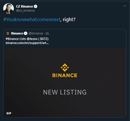 CZ then further created hype by asking the community that did they not what was coming next. A user suggested that does the move imply Tezos staking. While CZ didn’t give a definite answer, he expressed his excitement with a “happy” emoji.