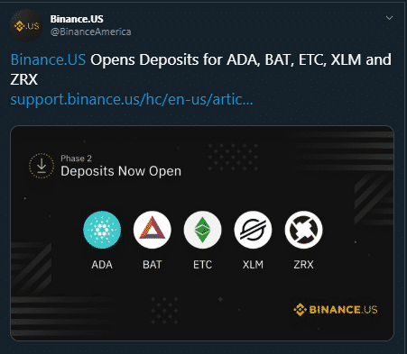 Today, Binance.US opened deposits for Cardano (ADA), Basic Attention Token (BAT), Ethereum Classic (ETC), Stellar (XLM) and 0x (ZRX). Trading for these coins will begin on September 25, 2019, at 9:00 AM EST /6:00 AM PST. The announcement further mentions that the coins are temporarily only available for deposits and withdrawals will not be enabled until trading is live.