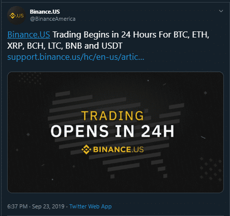 Also, Binance.US will commence trading on September 24, 2019 at 9:00am EST / 6:00am PST. The launch will see Binance.US list Bitcoin (BTC), Ethereum (ETH), Ripple (XRP), Bitcoin Cash (BCH), Litecoin (LTC), Binance Coin (BNB) and Tether (USDT). These coins will be available for trading across 13 fiat-to-crypto and crypto-to-crypto trading pairs.