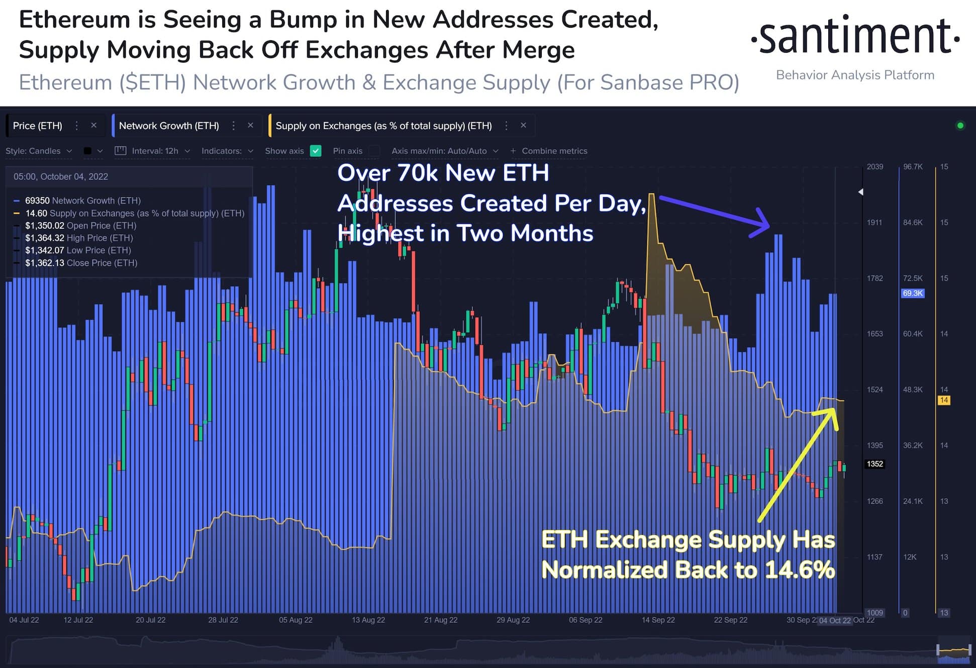 Ethereum’s amount of new addresses being created is hovering around 70k per day again, the highest seen since early August. And after quite a bit of uncertainty around the mid-September #merge, the supply of $ETH on exchanges has dropped back to 14.6%.