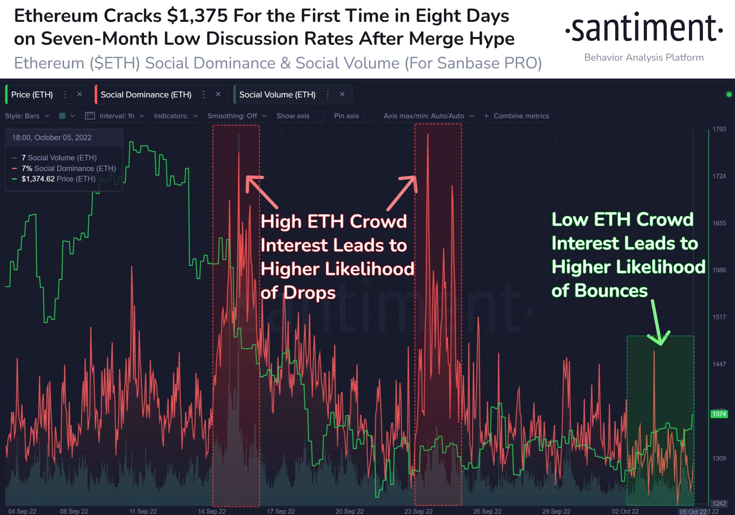 ETH is currently trading just above $1,375 and has reached here for the first time in the last eight trading sessions. However, the discussion rates around ETH have dropped to a seven-month low. On-chain data provider Santiment notes that the low crowd interest in ETH leads to a higher chance of a bounce. It adds: