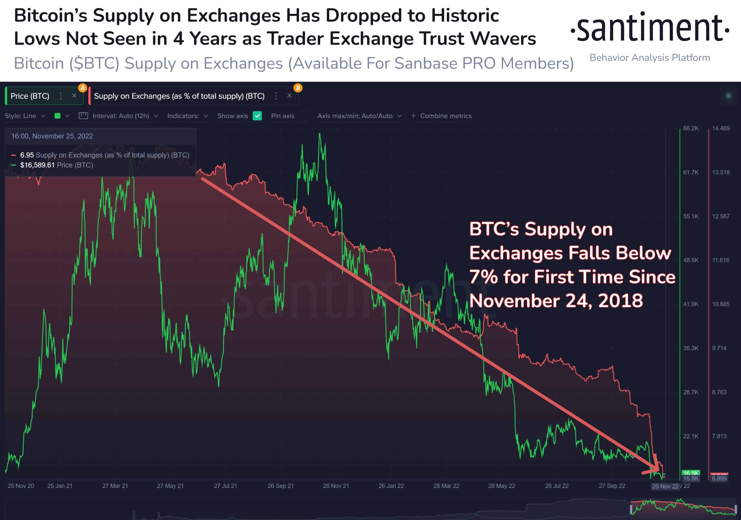 With the FTX crisis unfolding, a large number of Bitcoin investors have opted for self-custody as the trust in centralized players falls to a new low. The Bitcoin supply at exchanges has dropped to levels not seen in the last four years. On-chain data provider Santiment reported: