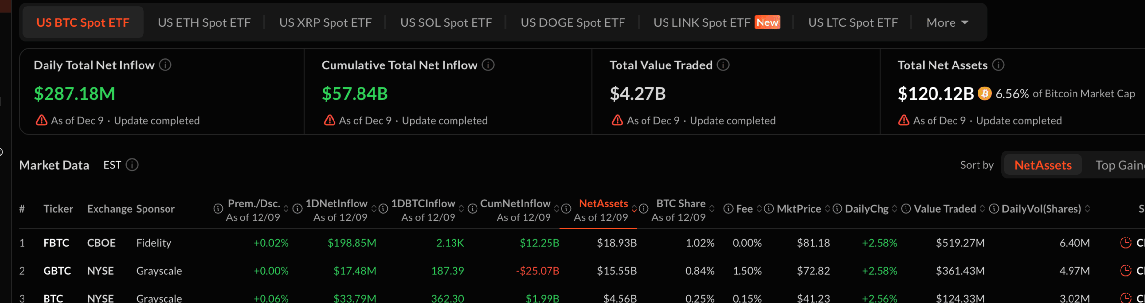 BTC briefly reached $94,000 but then stabilized around $92,000 as traders awaited the Federal Reserve’s interest-rate decision. On December 9, BTC ETFs also saw $287.18 million in net inflows. This is the largest it has seen in more than two weeks.
