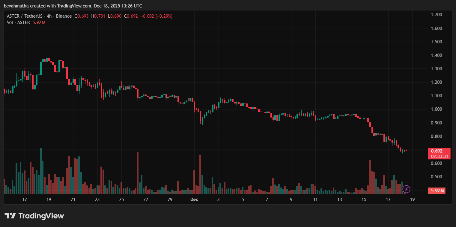 Aster price dropped 7.7% in the last 24 hours, underperforming the broader crypto market, which slid 0.7%. The price currently trades at $0.6925. Major coins like Bitcoin, Ethereum, XRP, and BNB also risk further downside. Overall, crypto market sentiment remains cautious, with volatility rising across altcoins