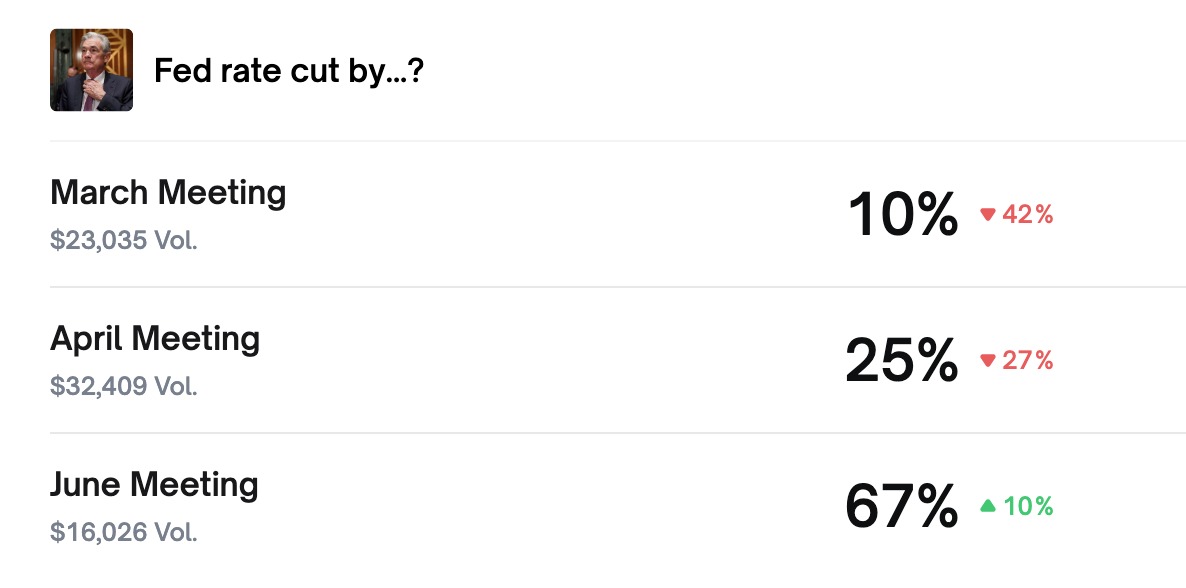 Polymarket data shows current expectations for upcoming meetings. March rate cut odds stand at 10%. April probabilities are near 25%. June expectations rose to 67%, mainly because Powell’s term ends in May.