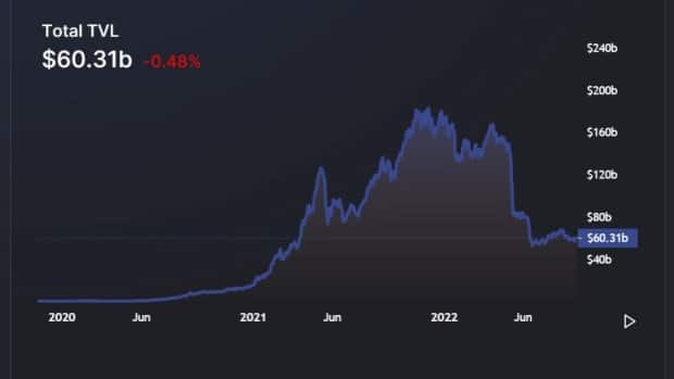 The total value locked (TVL) in decentralized finance (DeFi) is a key measure of interest in yield-generating digital assets. From its peak of $182 billion in December 2021, the TVL of the entire DeFi space has dropped to $60 billion now.