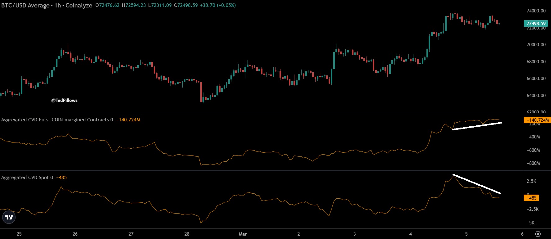 Yesterday, the digital asset had reached around $73,000. Derivatives activity has also changed the market outlook. According to analyst Ted, perps have started to feel bullish, and spot is selling, which is not a good scenario for $BTC.