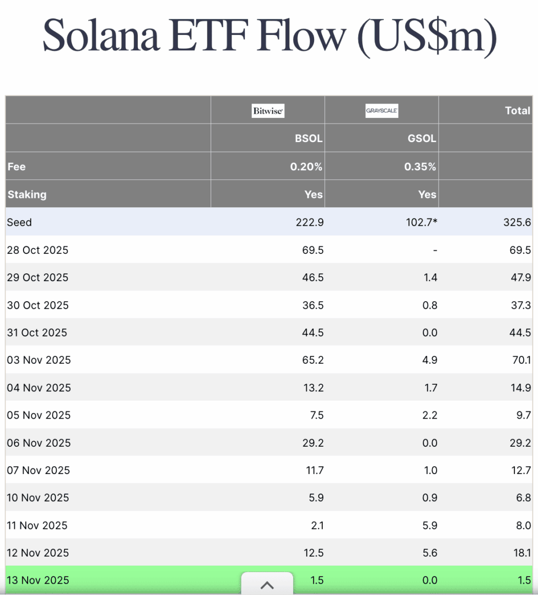 - Solana ETFs have now recorded a 13-day streak of inflows.