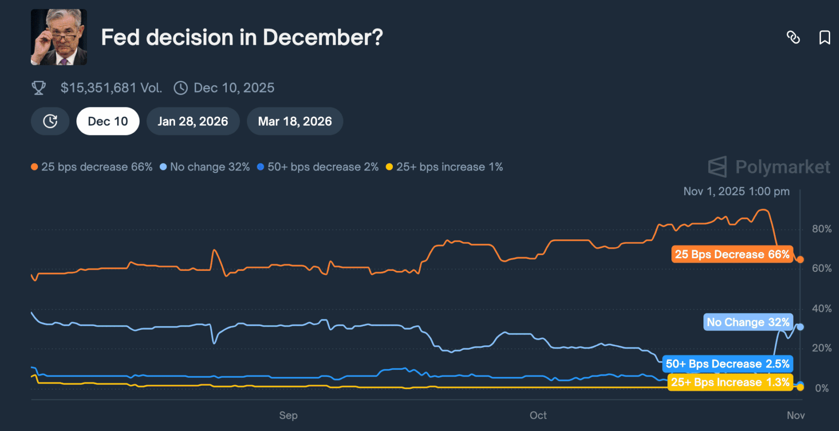 Meanwhile, traders still price in roughly 66% odds of one, according to Polymarket data.