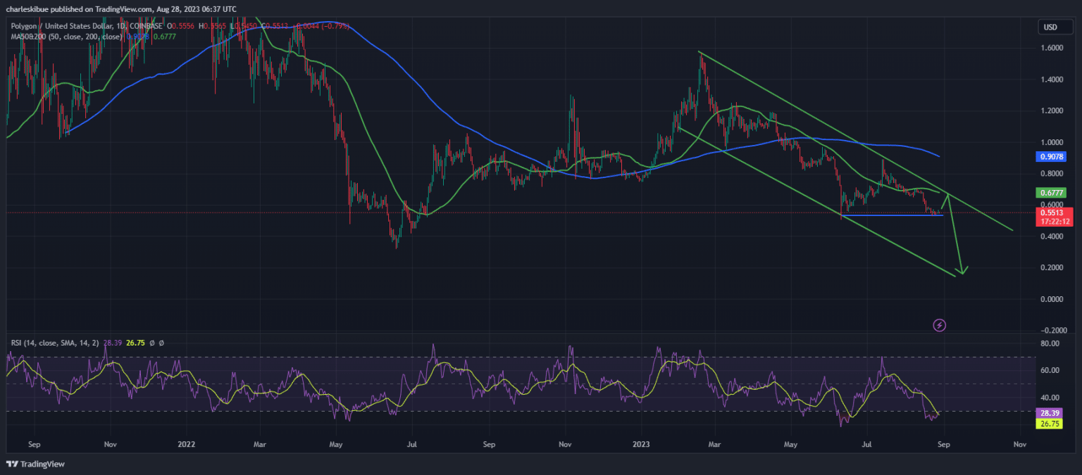 Furthermore, the MATIC price is already much below the 50-day and 200-day moving averages, currently at $0.67 and $0.90, respectively. The Relative Strength Index (RSI) reflects a short-lived recovery from the oversold zone below the 30 threshold, currently standing at 28. This implies that even though significant selling pressure persists, there are ongoing bullish attempts to push the RSI above 30.