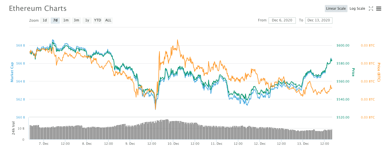 Ethereum (ETH) struggled to sustain above $600 levels as the craze around the launch of Ethereum 2.0 Beacon Chain fizzles out. Earlier in the week, ETH price made sharp correction losing 10% of its price. However, it had a sharp bounce back from $540 levels. Ethereum tested this support of $540 twice in the last week. ETH has recovered on its way back to $600 and is currently trading at $583 with a market cap $66.3 billion.